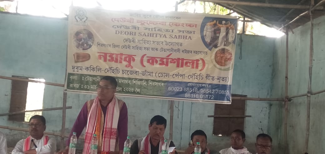 The 7-day Workshop (Nomaku) from 31/03/2025 to 06/04/2025 on Dhool & Pepa organised by DCC at Singioni Rajohuwa Prekhagriha, inaugurated by Dr. Saranan Deori, President, DCC in presence of Oban Deori, Chief Secretary, DCC, Jayanta Bhorali, Treasurer,DCC, President and Secretary of Sibsagar district DCC, concerned Branch Committee, participants and the local public.