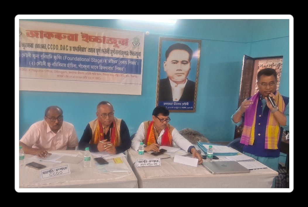 On April 27, 2024, a joint meeting was held at the regional office of DCC located in Dibrugarh ( (Bhimbar Deori Smriti Bhavan). Chief of DAC, Bhairav Deuri, President of Deori Sahitya Sabha, the Chief secretary along with members of the central committee of DCC and the President of the Dibrugarh district committee participated in the meeting. ২৭/০৪/২০২৪ তাৰিখে, ডিব্ৰুগড় স্থিত DCC ৰ আঞ্চলিক কাৰ্যালয়ত (ভীমবৰ দেউৰী ভৱন) এখনি যৌথ সভা অনুষ্ঠিত কৰা হয়। সভাত অংশগ্ৰহন কৰে দেউৰী জাতীয় সংগঠনৰ লগতে DACৰ Chief ভৈৰব দেউৰী দেব, দেউৰী সাহিত্য সভাৰ সভাপতি আৰু প্ৰধান সম্পাদককে ধৰি কেইবাজনো কেন্দ্ৰীয় কমিটিৰ সদস্য আৰু কেইবাগৰাকী জিলা সমিতিৰ সভাপতি/ সম্পাদকে।
